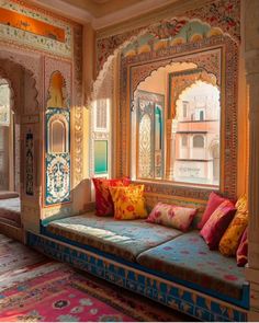 This exquisite image captures the charm of a traditional Indian palace interior, adorned with intricate hand-painted designs, vibrant textiles, and mesmerizing architectural details. The ornate window frames and colorful cushioned seating reflect the regal lifestyle of India’s rich cultural past. Sunlight pours through the windows, illuminating the patterns and creating a warm, inviting ambiance. The blend of Mughal and Rajasthani artistic influences is evident in the floral motifs and...
