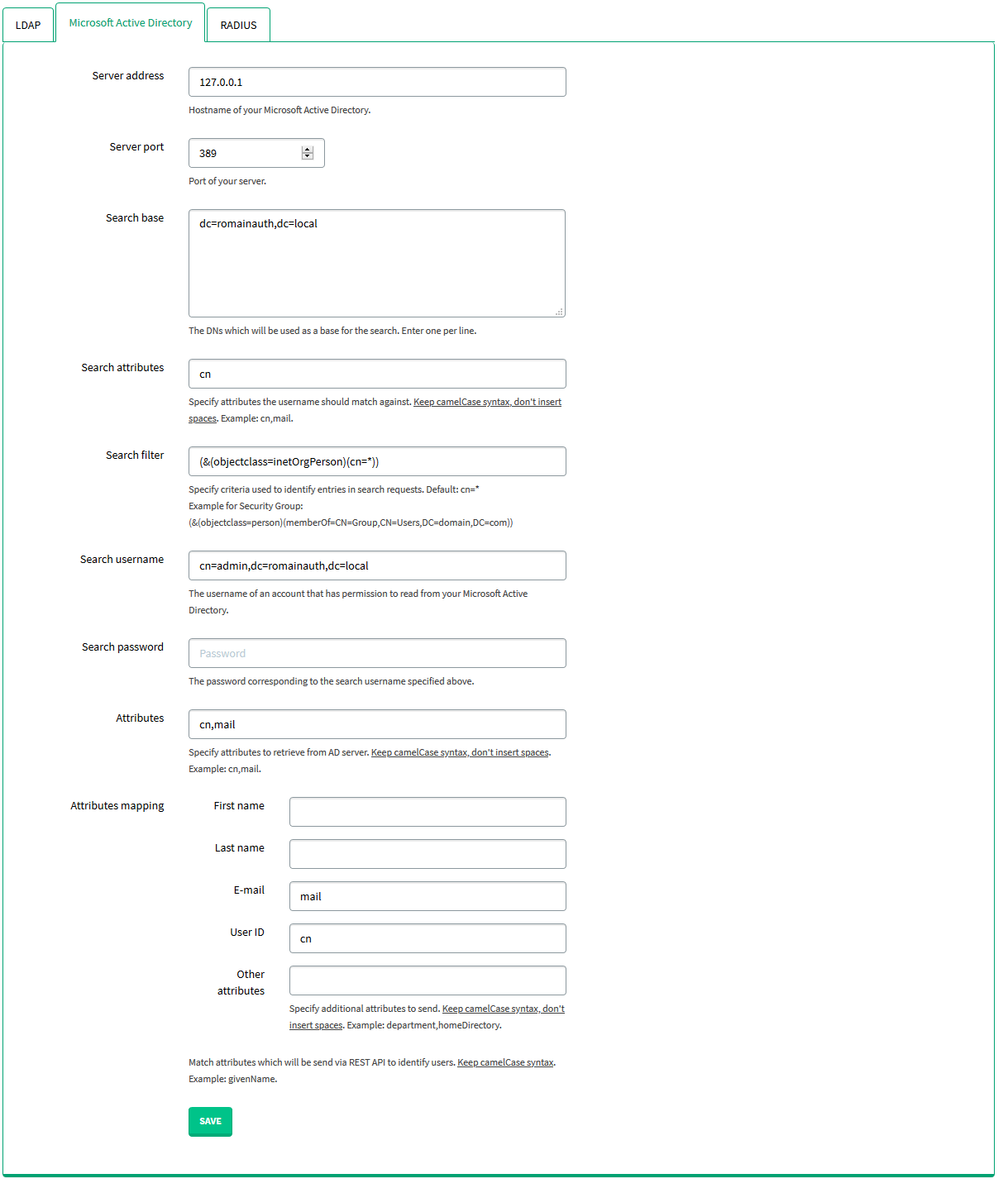 Attributes mapping | Match attributes, which will be sent via REST API to identify users. Stick to the camelCase syntax and do not use spaces, e.g. givenName, department, homeDirectory. |