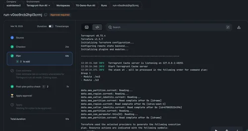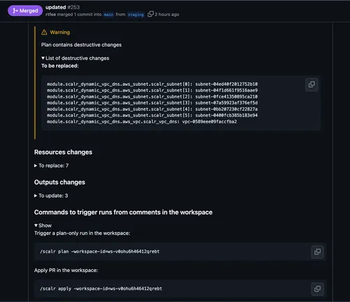 Get complete deployment context directly in your pull requests with resource changes, policy results, and more.