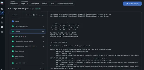 Shift security left with pre-plan checks including OPA policies, Checkov scans, automated formatting, and validation.