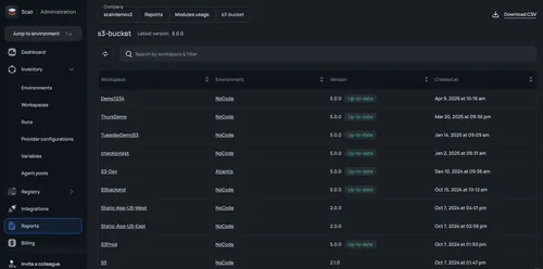 Identify patterns, detect drift, and monitor adoption through detailed reports on module and provider usage, with automatic flagging of outdated workspaces.