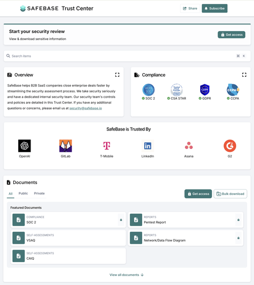 Streamline the inbound security review process and build customer trust upfront with self-serve access to security and compliance information with an enterprise-grade Trust Center.