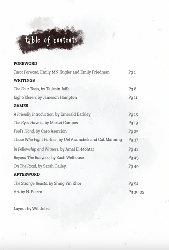 When I began making the Strange Beast Tarot, I always knew that I wanted to ask some friends that I’ve had the honor of knowing and working with over the years to contribute to a little collection of writings and games. This to me is in thespirit of the DIY culture I became an artist in, one rooted in collaboration and photocopied zines and messy unpolished art, even as so many of my friends are now professionals working at the absolute top of their fields.