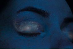 a close up of a person's eye with blue light shining through it and stars in the background