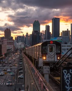 a train traveling through a city next to tall buildings and traffic lights at dusk with the sun setting in the distance