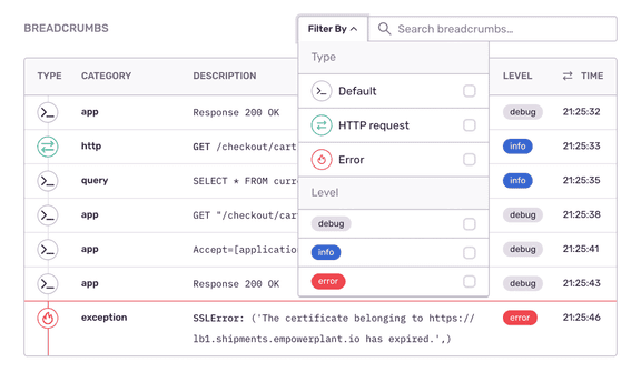 See local variables in the stack for prod errors, just like in your dev environment. Introspect more deeply into the runtime and jump into the frame to get additional data for any local variable. Filter and group Python exceptions intuitively to eliminate noise.
