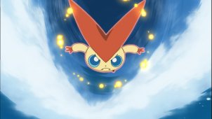 This movie is the first movie in the Pokémon Best Wishes Movie Series. It is scheduled for Japanese release in July 2011 and will likely, based on previous movies and events, offer a download of Victini to your Black & White games. The movie opens as usual with scenes of various Unova Pokemon on land, in the sea, and in the air. Ash and Pikachu battle against a Throh (in Black)/Sawk (in White). The trio keeps walking until they come to a fork in the road. They take the right fork on the road in Black, and the left fork in White. In Black Hero: Zekrom, Dread is walking through a hot desert when he sees a Blitzle with an injured leg. With Reinculus's psychic help to lift it up onto his shoulder, he walks back to the small village to return Blitzle to its owner, a little girl. Her father thanks Dread for his help but tells him to go home, and his plight is useless. Dread begs them to believe him that the Hometown of Earth can be revived, but they turn him away. Suddenly a huge tornado tears through the desert towards the village, stirring up a stampede of Bouffalant. The villagers look on helplessly, but Dread marches towards the disaster and holds up his hand. Reshiram appears and Dread climbs on its back, riding as it destroys the tornado and halts the stampede. Dread asks the townspeople, stunned by the dragon's appearance, to give him another chance. In White Hero: Reshiram, the setting is a frozen snowy countryside, and a young boy and his parents are attempting to gather precious plants without disturbing some fighting Beartics. Dread has been turned away by this village as well, but when a glacier crashes into the coast and strands the boy and his parents with the Beartics in the middle of the frozen lake, Dread summons Zekrom, who destroys the glacier. Again he asks them to give him another chance to speak as they look at Zekrom, shocked. Meanwhile, back near Ash and company, two Deerlings are playing nearby on a cliff, but one is startled by Victini peeking out from a crack in the rock and begins to fall, as the other grabs it by the tail. Ash hurries over to help, but as he grabs them both, he also slips as the rock crumbles. Victini grabs him on the foot just as he falls, and he is able to jump a hundred body lengths to a far cliff down below the big Castle looming over the city. He tells Iris and Cilan to go on ahead and he will meet them after. While he walks through the cave, rather lost, Victini continues to give him psychic visions showing him the right ways to go. At one point Ash, Pikachu and the Deerlings walk through a cave with many rock walkways, and an orb sitting at the very bottom briefly glows and illuminates the entire cavern. Ash gets out and Iris and Cilan come up to the Castle to meet him. Cilan mentions that legend says the Castle flew from a barren looking valley visible in the distance to the mountain top. At his companion's disbelief he says it is only what people say, but it's definitely true the town has incredibly delicious fruits. Ash longs to eat some, announcing he is always hungry, and Cilan offers macaroons in a basket. As they make their way through the Castle to the town below, Ash's macaroons continue to vanish before he can pop them in his mouth, as Victini, invisible, steals them. Fireworks begin to go off in town, making Victini choke mid-swallow, and sending the trio rushing to find a way out so they don't miss the cut-off time for the tournament. As they wander aimlessly, Dread appears and offers to help, saying he's helping at the Castle at the moment. He guides them out and they sign up for the tournament. While walking in town they see a Golurk, and follow the huge Pokemon until they meet its trainer, Janta, a woman running a souvenir cart full of Victini plush and other goods. While Victini watches invisibly, she explains Victini is a Pokemon said to live in town, and will bring power to people. Ash wishes he could meet such a Pokemon, but she says hardly anyone has ever seen Victini. Iris buys a little wooden Victini charm to bring her luck in the tournament. Team Rocket overhears, and decides to abandon plans to capture Pikachu to get a Victini instead. The mayor of the town, Mo-monto, announces they have all had another wonderfully bountiful harvest, congratulating the townsfolk, then starting the tournament as he explains each participant has a wooden necklace. While in town, they must battle people at random, and whoever loses gives up their necklace. He officially begins festivities with his Klink evo-line Pokemon powering up a street organ to play music. The tournament begins and a Serperior battles against Pikachu first, being defeated. Iris battles Emboar with Emolga, who uses Volt Change which sends out Iris' Excadrill instead, forfeiting the match. Iris glares at Emolga who makes a cute face hoping to be forgiven. Iris hurries to see Cilan's battle, her eyes lighting up as she fangirls over the Hydreigon his Pansage is battling. He and Pansage look annoyed until she becomes sheepish and cheers for them instead, but in vain as Pansage is defeated. Next, Ash's Oshawott battles Emboar, successfully keeping its eyes open as it uses Aqua Jet, defeating Emboar. Scraggy, who is out of his ball as Ash plans to use him, does a victory dance, swinging his pants from side to side, then holding his arms up, Victini suddenly appearing in front of him as it dances as well, startling him. He looks around in confusion before running after Ash to the next battle. It is Samurott versus Tepig. Tepig's Ember doesn't even budge Samurott, who sends it flying into the Victini toy cart run by Janta. Victini was hiding in it, and touches Tepig, who instantly powers up, his eyes bugging out as he speeds back out ready to fight. Ash orders Ember again, Cilan and Iris gaping in disbelief, but the attack is humongous, engulfing the entire street in flame and knocking out Samurott. Karita, the trainer of Hydreigon, who was helping her mother (Janta) clean