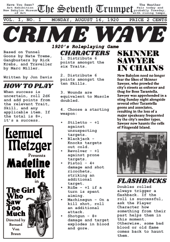 CRIME WAVE is a one-page hack of Tunnel Goons by Nate Treme, Gangbusters by Rick Krebs, and Traveller by Marc Miller. It was originally submitted to the One-Page RPG Jam 2022.