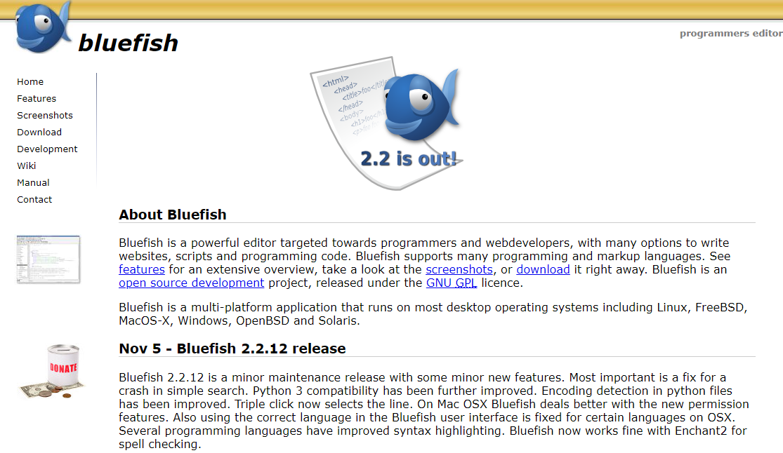 Bluefish is a powerful editor targeted towards programmers and web developers, with many options to write websites, scripts and programming code. Bluefish supports many programming and markup languages. See features for an extensive overview, take a look at the screenshots, or download it right away. Bluefish is an open-source development project, released under the GNU GPL license. Bluefish is a multi-platform application that runs on most desktop operating systems including Linux, FreeBSD, MacOS-X, Windows, OpenBSD and Solaris. Bluefish 2.2.12 is a minor maintenance release with some minor new features. Most important is a fix for a crash in a simple search. Python 3 compatibility has been further improved. Encoding detection in python files has been improved. Triple-click now selects the line. On Mac OSX Bluefish deals better with the new permission features. Also using the correct language in the Bluefish user interface is fixed for certain languages on OSX.