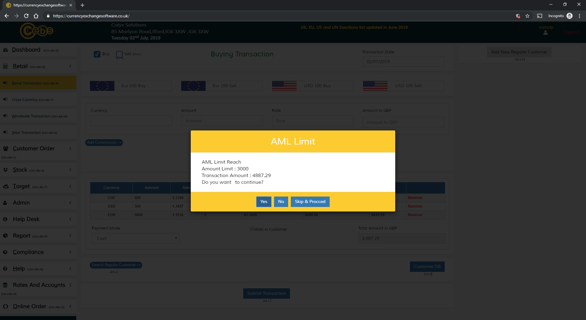 CEBS makes sure you have the right checklist of KYC documents by setting up Simple Due Diligence, Customer Due Diligence and Enhanced Due Diligence as and when required. System alerts the cashier if the same customer is transacting above threshold. Customer name is searched against HMRC, UN, EUand US OFAC SDN sanctions list.
