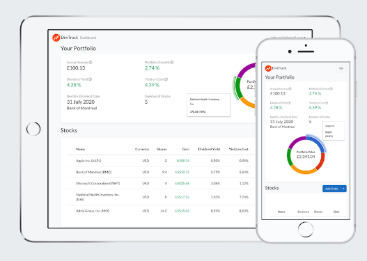 Track and estimate your dividend income easily in one place for free. Get notified of ex-dividend dates. Estimate dividend income a year in advance. Separate your holdings with multiple portfolios. Record shares down to 8 decimal places. Our symbols cover UK, US, European and other listings. Add your portfolio for free to try us out. DiviTrack was made to help you keep track of your dividend stocks. We provide you with market data from multiple sources and display it against the portfolio data you upload. We can then calculate metrics like the yield on cost and estimated annual income to show you. We hope to include lots of extra features soon. Currently, all stock prices are updated at 07:00 UTC with the previous close price. All dividends and prices are adjusted for splits. Currently, this is not something we support. You can add each reinvestment manually by clicking the add order button.