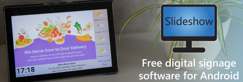 Digital Signage software for Android. Easy to use on various devices. Just install Slideshow application on your Android smartphone, tablet, TV, stick or box, run it and insert a USB flash drive with files. Slideshow will automatically start to display them in a loop. Support for many different file formats. Slideshow can display various image (JPG, PNG, BMP, GIF, WEBP, SVG), video (AVI, MPEG, MP4, MOV, WMV, MKV) and audio formats (MP3, AAC, FLAC, WAV, OGG, MID). Additionally, it supports displaying text (TXT), Excel (XLS, XLSX), PDF and HTML files without any need for additional setup or external service. Add new files via USB, FTP, Web interface or Google Drive. Files can be automatically copied from USB flash drive. If you connect your device to local network via WiFi or Ethernet cable, you can also add new files through FTP , from your browser via web interface or synchronized from your Google Drive folder.