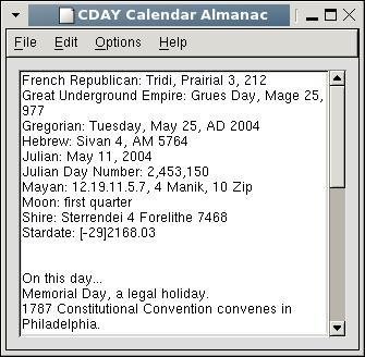 What happened on this day in history? Lists event and birthdays for a given date. Includes plenty of starter data, or add your own. Displays date in multiple calendars such as Hebrew, Mayan, and Shire (LOTR). GUI, CLI, web interface.