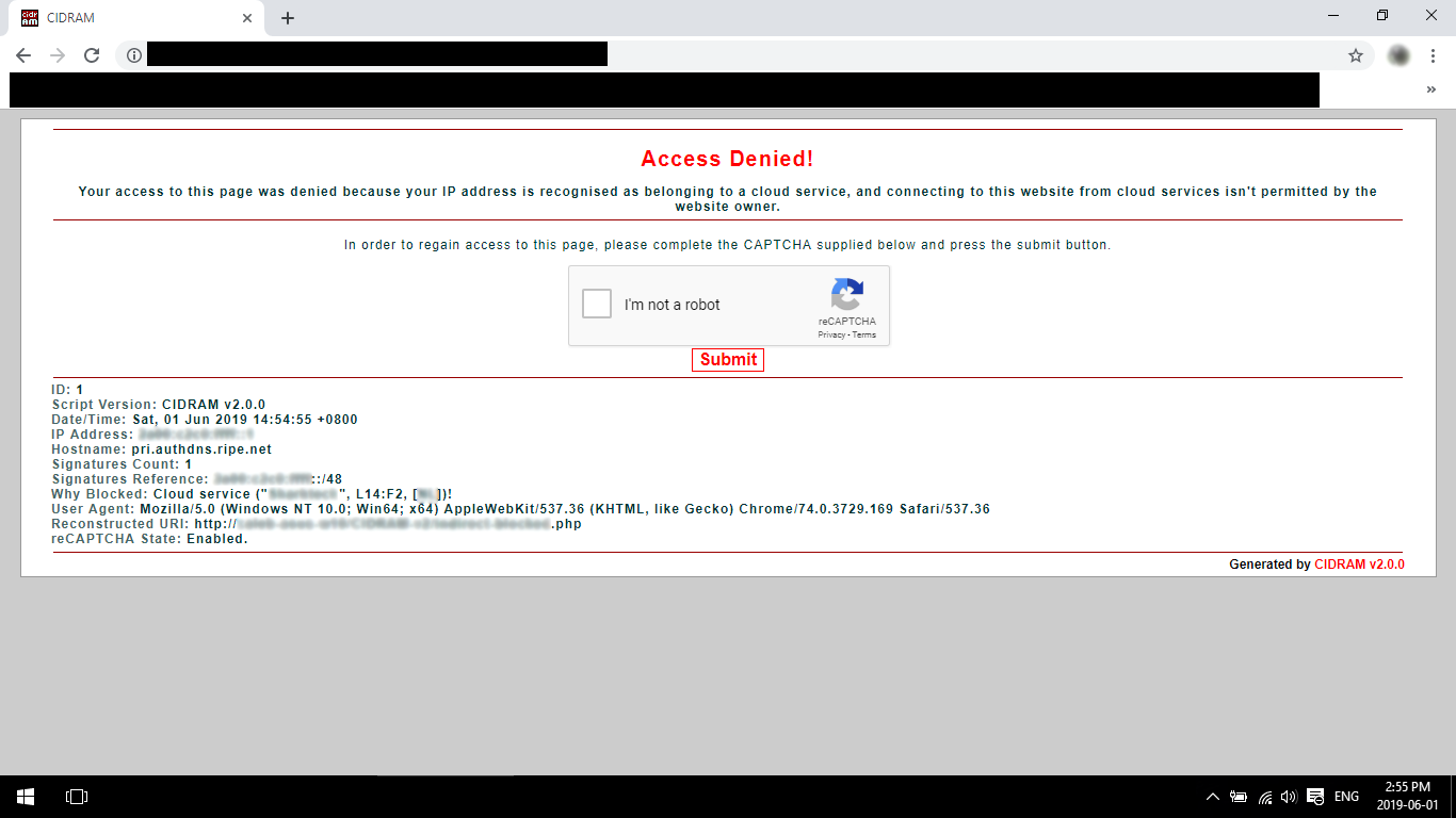 CIDRAM (Classless Inter-Domain Routing Access Manager) is a PHP script designed to protect websites by blocking requests originating from IP addresses regarded as being sources of undesirable traffic, including (but not limited to) traffic from non-human access endpoints, cloud services, spambots, scrapers, etc. It does this by calculating the possible CIDRs of the IP addresses supplied from inbound requests and then attempting to match these possible CIDRs against its signature files (these signature files contain lists of CIDRs of IP addresses regarded as being sources of undesirable traffic); If matches are found, the requests are blocked.