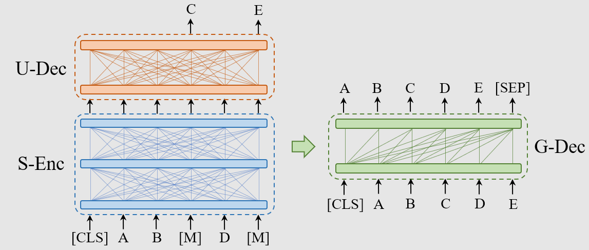- Shallow Transformer encoder with fully-connected self-attention, which is designed for NLU tasks. The input of U-Dec is the output of S-Enc.