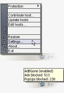 AdBGone is a small, and useful piece of software that runs in the background, blocking PopUps, and replacing those annoying internet advertisements (banners, logos, etc.) with the AdBGone logo, solid background, or some raw HTML of your choice.
