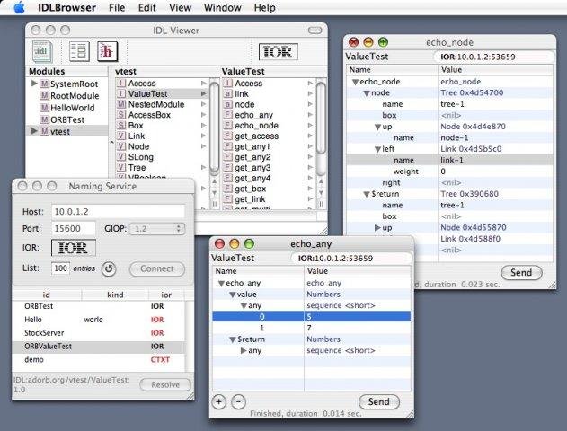 Advanced CORBA/IIOP implementation with run-time IDL parsing, dynamic bindings and native IDL to Objective C mapping. Includes graphical tool to browse IDL definitions, to view Naming Service hierarchy and to invoke arbitrary CORBA remote operations.