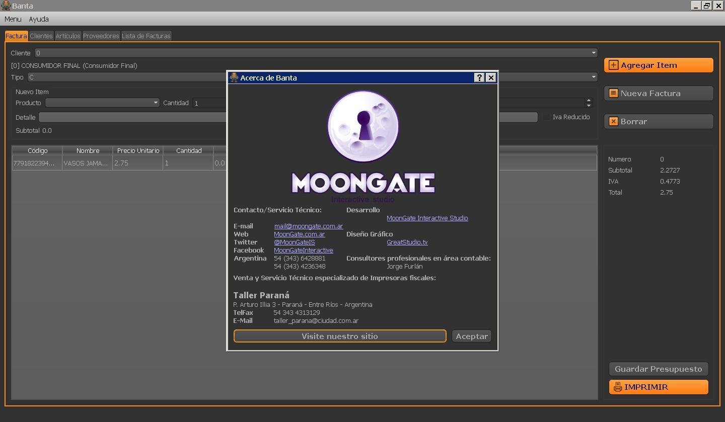 Banta keeps clean your daily work. Banta helps you with: Account, point of sale, List of articles, Manage product, prices, taxes, stock, List of providers, Different pay methods, allowing to adjust your prices where is needed. Runs in Windows, MacOSX, Linux/Ubuntu