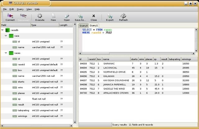 GtkSQL is a graphical front-end for PostgreSQL, MySQL and SQLite. It provides an easy interface to write and run SQL queries. Currently working on: Database tree interface.