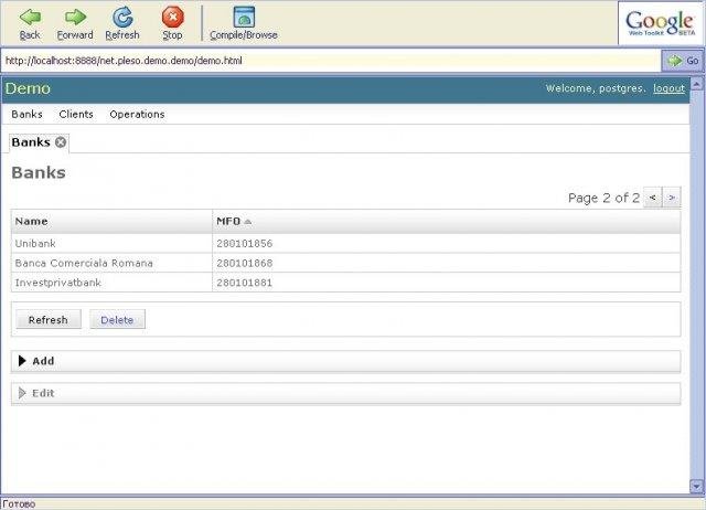 GWT Pleso Framework is a high-level framework based on Google Web Toolkit (GWT) for creating visual AJAX database front-end user interfaces. GWT Pleso Framework enables you to create automatically generated user interface based on business-logic classes.