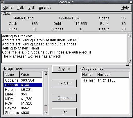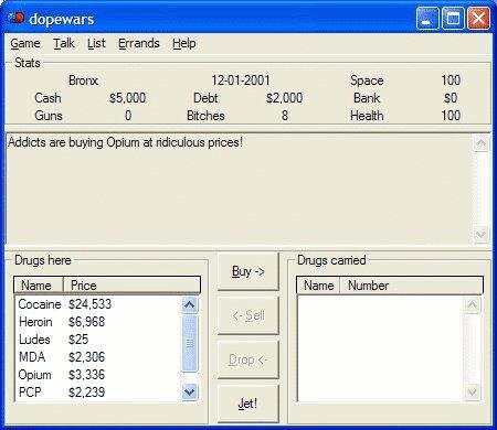 dopewars is a drug dealing game based on "Drug Wars" by John E. Dell. Originally set in New York, your aim is to deal in drugs and make your fortune...