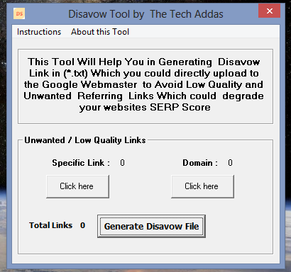 This Tool Will Help You in Generating Disavow Link in (*.txt) Which you could directly upload to the Google Webmaster to Avoid Low Quality and Unwanted Referring Links Which could degrade your websites SERP Score.