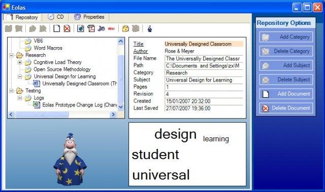 Eolas is a personal content management system for teachers of all levels. It aims to provide added features such as text-to-speech, CD burn, save as wiki/html/wap & to easily provide accessibility to teacher's docs based on Universal Design Techniques.