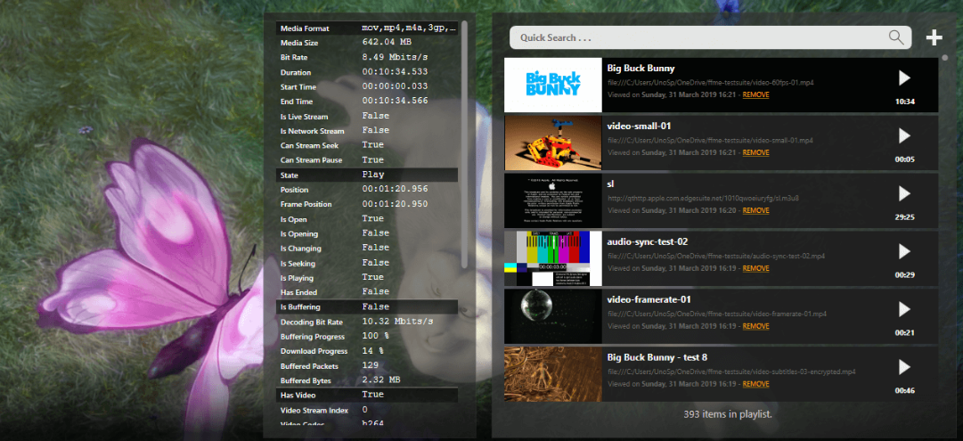 FFME: The Advanced WPF MediaElement (based on FFmpeg). FFME is an advanced and close drop-in replacement for Microsoft's WPF MediaElement Control. While the standard MediaElement uses DirectX (DirectShow) for media playback, FFME uses FFmpeg to read and decode audio and video. This means that for those of you who want to support stuff like HLS playback, or just don't want to go through the hassle of installing codecs on client machines, using FFME might just be the answer. Fast media seeking and frame-by-frame seeking. Properties such as Position, Balance, SpeedRatio, IsMuted, and Volume are all Dependency Properties. Additional and extended media events. Extracting (and modifying) video, audio and subtitle frames is very easy. Easily apply FFmpeg video and audio filtergraphs. Extract media metadata and specs of a media stream (title, album, bit rate, codecs, FPS, etc). Apply volume, balance and speed ratio to media playback. MediaState actually works on this control.