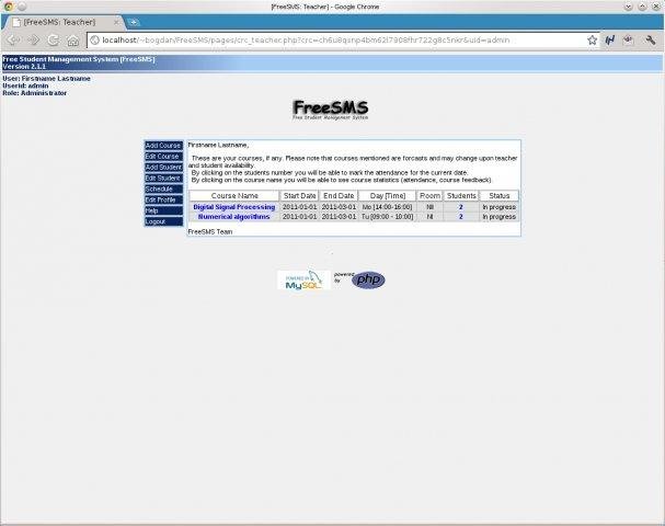 FreeSMS is a PHP based application to manage an educational facility of teachers and students alike. It is a teacher and student management system providing marketing, registration, course management, attendance and a student evaluation system.