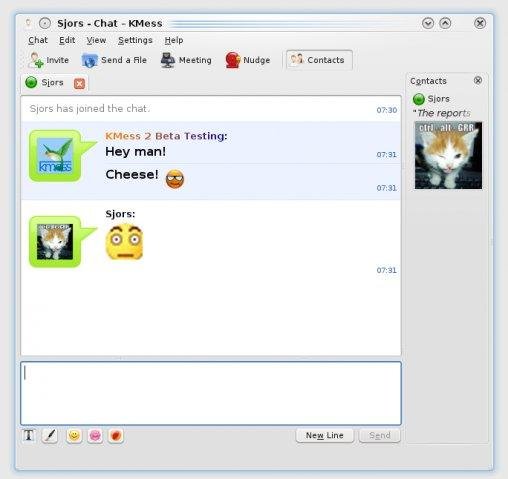 KMess is an MSN/Live Messenger compatible chat client for Linux. The strength of KMess is it's integration with the KDE desktop environment, focus on Live Messenger specific features and an easy-to-use interface.