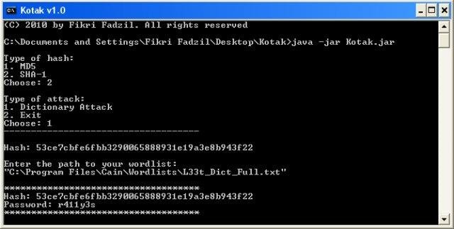 Kotak is just another cracking tool which is based on Java. It is used to crack various types of hash functions with various types of attacks. It's developed to be as simple as possible, so that anyone can use this tool easily.