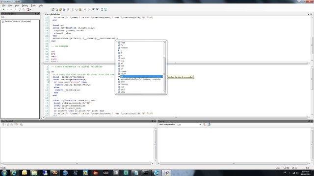 LuaEdit is an IDE/Text Editor/Debugger for the Lua language. Its interface looks like MS Visual Studio .Net� and includes syntax highlighting, code completion, advance breakpoint management, efficient search engines, etc. Client under GPL and server (core debugger) under LGPL.