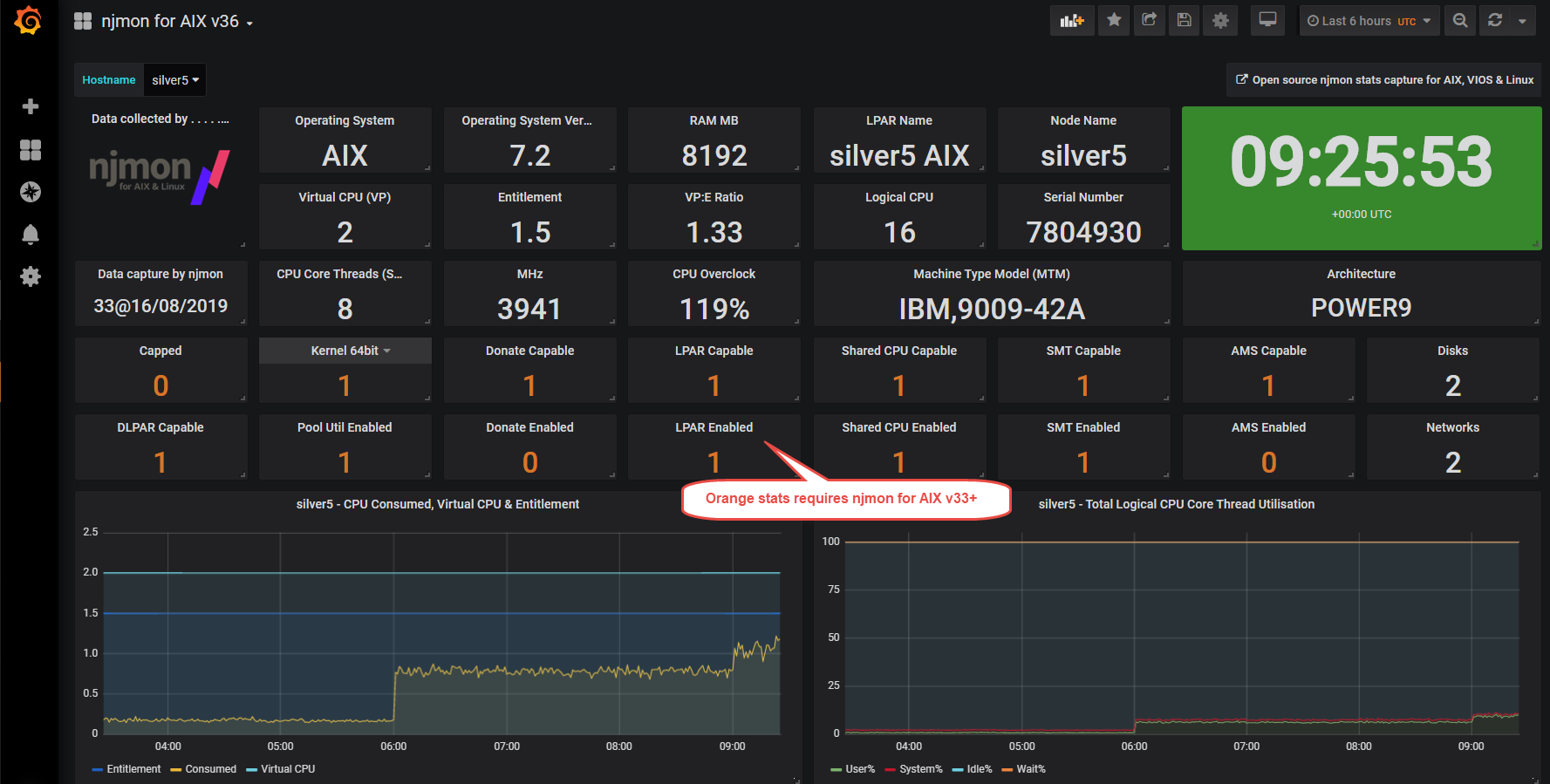 - njmon allows real-time stats graphing via InfluxDB + Grafana and a bunch of similar tools