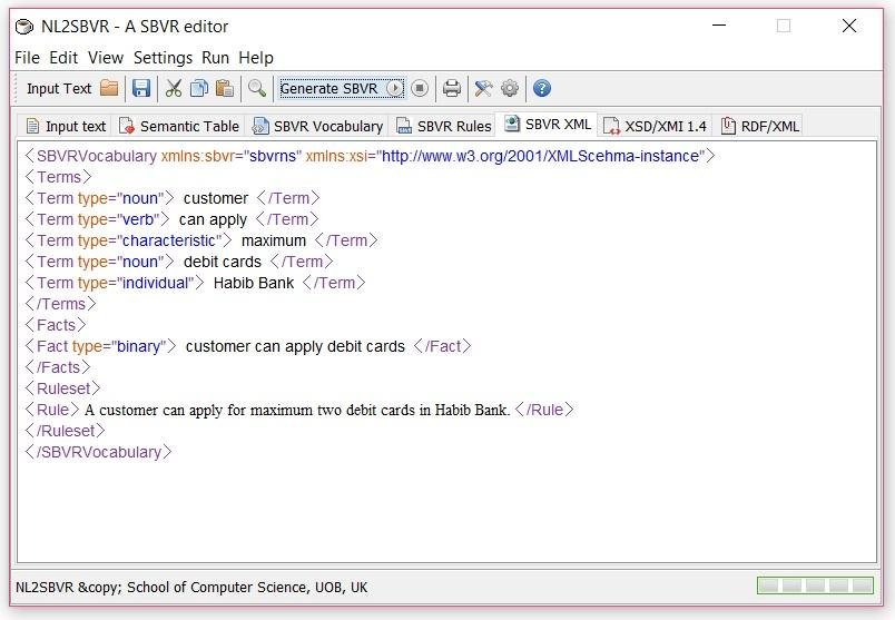 NL2SBVR 3.0 is a SBVR editor to generate and edit SBVR Vocabulary and SBVR Rules from natural language description . The tool supports Structured English notation of SBVR and also generates XML metadata of SBVR rules in XSD 1.4.