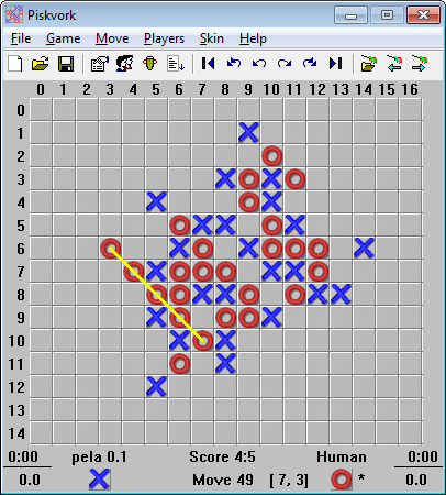 Gomoku (five in a row) and Renju game which has a skinable board and external artificial intelligences from China, Hungary, Czech Republic, Russia, Japan and USA. The board size and time limits are customizable.