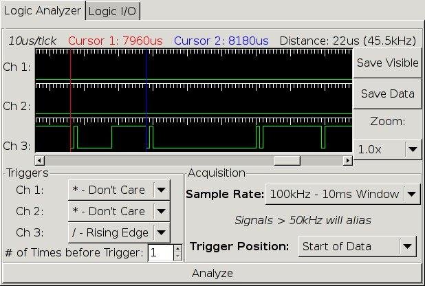 The Microchip PICkit 2 has the ability to act as a logic analyzer and I/O probe. This project provides a reverse engineered libusb user space device driver and GUI to provide this functionality for users of unsupported operating systems.