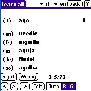 Language Tutor is a tool, useful in learning and memorizing new word in a foreign language. It supports up to 6 languages simultaneously, uses flash cards and other exercises or games and may be used as a quiz tool. It works on Palm or Windows.