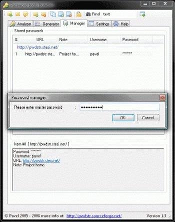 The Password tools bundle is one application combining three tools - the Analyser (shows the "strength" of your password, the Generator (generates "strong" passwords) and the Manager (stores passwords securely using Rijndael).