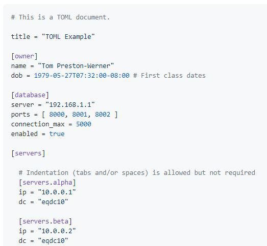 Tom's Obvious, Minimal Language. By Tom Preston-Werner, Pradyun Gedam, et al. TOML aims to be a minimal configuration file format that's easy to read due to obvious semantics. TOML is designed to map unambiguously to a hash table. TOML should be easy to parse into data structures in a wide variety of languages. TOML shares traits with other file formats used for application configuration and data serialization, such as YAML and JSON. TOML and JSON both are simple and use ubiquitous data types, making them easy to code for or parse with machines. TOML and YAML both emphasize human readability features, like comments that make it easier to understand the purpose of a given line. TOML differs in combining these, allowing comments (unlike JSON) but preserving simplicity (unlike YAML). Because TOML is explicitly intended as a configuration file format, parsing it is easy, but it is not intended for serializing arbitrary data structures.