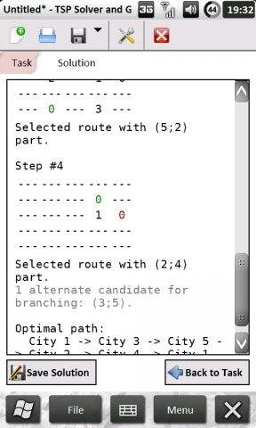 TSPSG is intended to generate and solve Travelling Salesman Problem (TSP) tasks. It uses Branch and Bound method for solving. An input is a number of cities and a matrix of city-to-city travel prices. The matrix can be populated with random values in a given range (useful for generating tasks). The result is an optimal route, its price, step-by-step matrices of solving and solving graph. The task can be saved in internal binary format and opened later. The result can be printed or saved as PDF, HTML, or ODF.