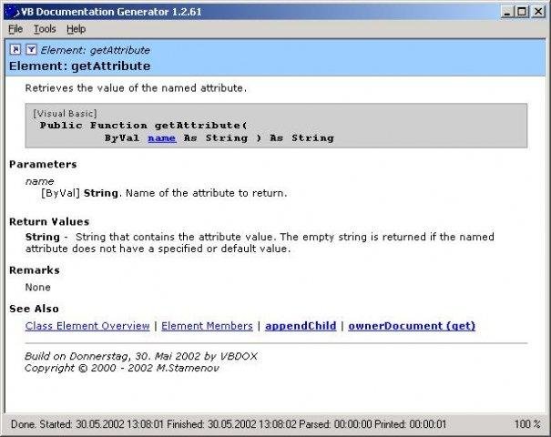 VBDOX is a simple program that generates technical documentation from source comments. The only requirement is to use specific module and function comments format. Documentation is generated for all types Visual Basic files and also fo VBScript and ASP.