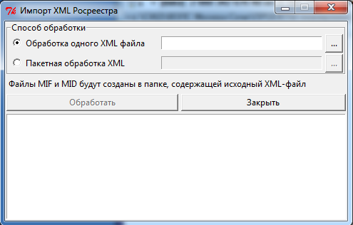 Средство обработки файлов XML Росреестра (кадастровый план территории, кадастровая выписка об объекте недвижимости). По результатам обработки формируется пакет файлов mid/mif для последующего импорта в GIS MapInfo. Поддерживается одновременная обработка большого количества файлов XML. Для работы требует установки в системе интерпретатора Python 2.7 (можно взять отсюда: