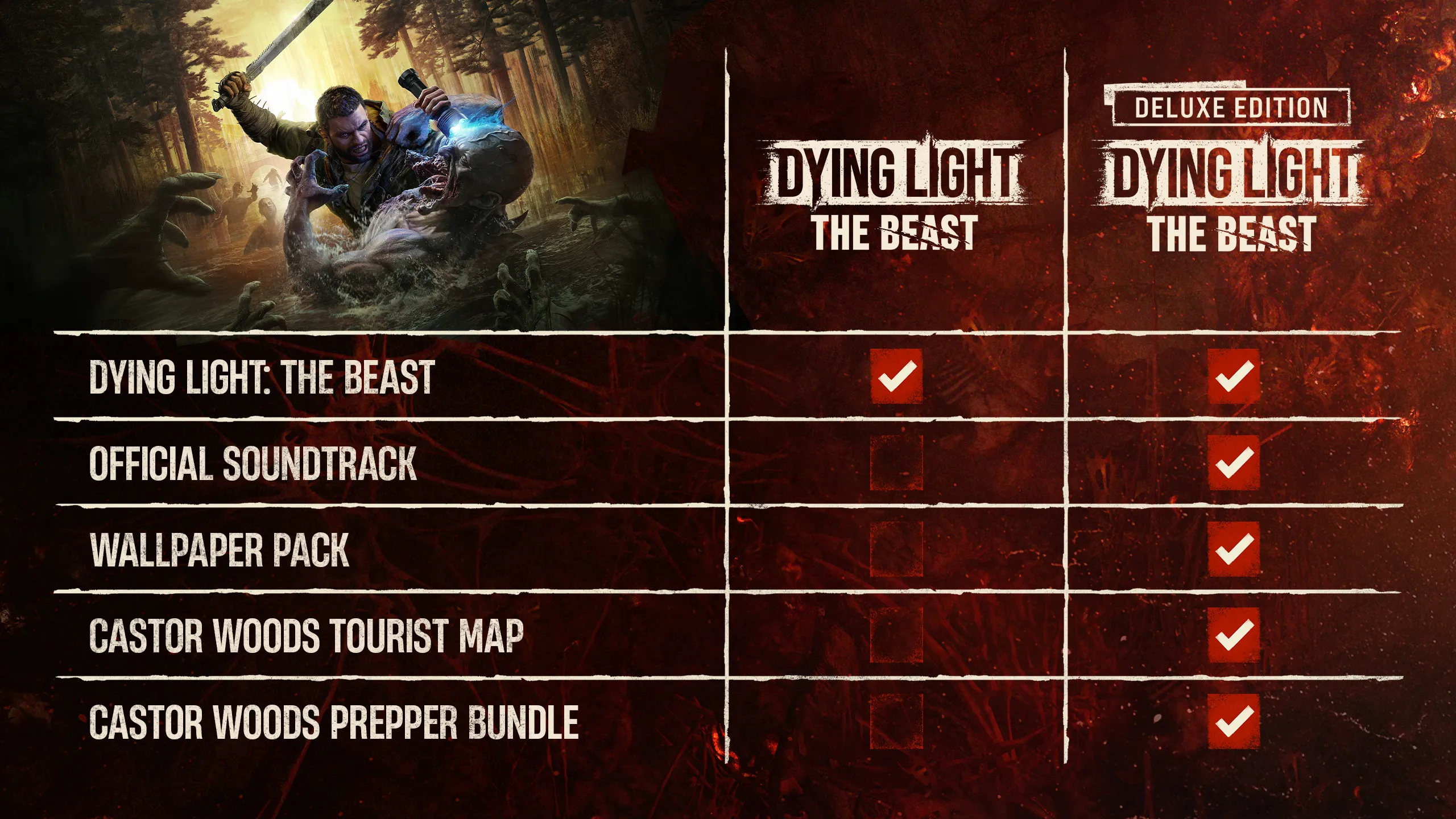 Take your Dying Light: The Beast experience to another level with the Deluxe Edition. You'll receive the Official Soundtrack, wallpapers, and the Castor Woods Prepper Bundle, as well as a detailed tourist map that highlights locations worth exploring.