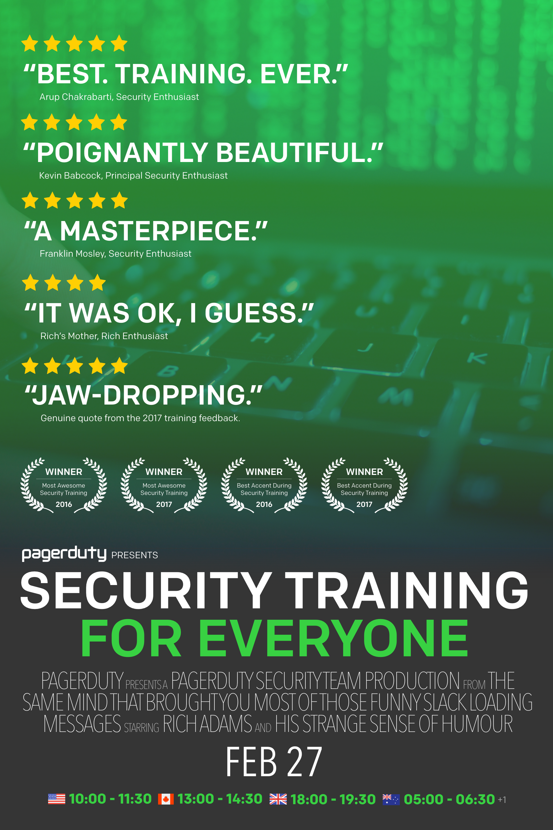 Our "For Everyone" course covers a variety of general security topics relevant to all employees. It is delivered annually to all PagerDuty employees, contractors, and interns. Since 2018 we have produced a new "part" each year in order to keep the material fresh for employees who have already been through the training. The overall lessons are the same, but we dive deeper into different topics each year. Click the slides below to view the relevant course, starting with "For Everyone" in 2018, then "For Everyone Part II" in 2019, and most recently "For Everyone Part III" in 2020.